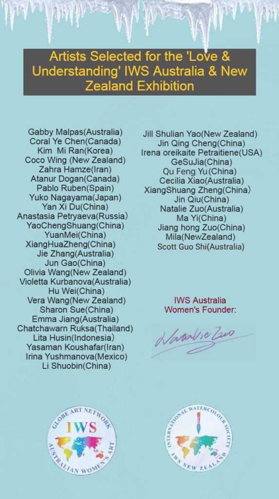 We are honored to announce the selected artists for the “Love & Understanding” IWS Australia & New Zealand Joint Watercolour Exhibition! A total of 43 outstanding artists from around the world have been selected for this exhibition. Through the medium of watercolor, they depict love, understanding, and the emotions we all share as human beings. They come from the following countries and regions: